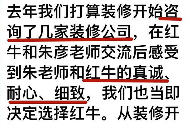 這次有幸與紅牛裝飾公司合作裝修房子,使我深受感動!在這三個月的裝修時間里,設(shè)計師顧娟,項(xiàng)目經(jīng)理王志堅(jiān),工程監(jiān)理宋昕,三位老師給我留下了良好而又深刻的印象。設(shè)計師顧娟工作責(zé)任心強(qiáng),對項(xiàng)目管理嚴(yán)格,以身作則模范帶頭作用好,服務(wù)耐心,熱情,工作標(biāo)準(zhǔn)高。工程監(jiān)理宋昕業(yè)務(wù)能力強(qiáng),作風(fēng)深入扎實(shí),對質(zhì)量要求嚴(yán)格,工作深入扎實(shí),很好地為施工質(zhì)量把了關(guān)。在三位的帶領(lǐng)下,工程隊(duì)的師傅們以高度負(fù)責(zé)的精神保質(zhì)保量高標(biāo)準(zhǔn)地完成了任務(wù)。在這里,我感謝紅牛裝飾公司的領(lǐng)導(dǎo)!更感謝戰(zhàn)斗一線的領(lǐng)導(dǎo)和工人師傅們!